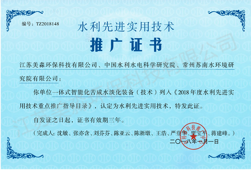 多項(xiàng)技術(shù)獲得了國家火炬計(jì)劃、江蘇省科技進(jìn)步獎(jiǎng)、水利部先進(jìn)推廣成果;成為美國水質(zhì)協(xié)會(huì)(WQA)會(huì)員企業(yè)成員,江蘇省循環(huán)經(jīng)濟(jì)協(xié)會(huì)副會(huì)長(zhǎng)單位(水專業(yè)委員會(huì)主任單位);